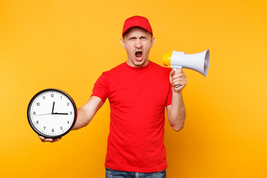 Delivery service man in red uniform isolated on yellow background. Male employee courier in cap, t-shirt scream in megaphone hold clock. Guy announces discounts sale Copy space advertisement Hurry up.