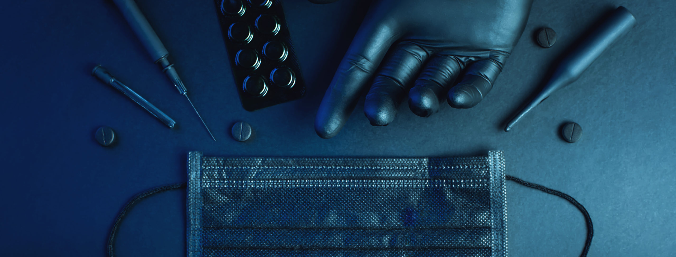 A switch on the virus. Hand in glove, mask, tablets, syringe, vials lie against a dark background