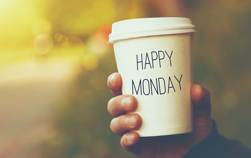 hand holding paper cup of coffee with Happy Monday motivational text on natural morning background