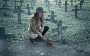 Sad woman in the cemetery, holding a bouquet of roses in her hand